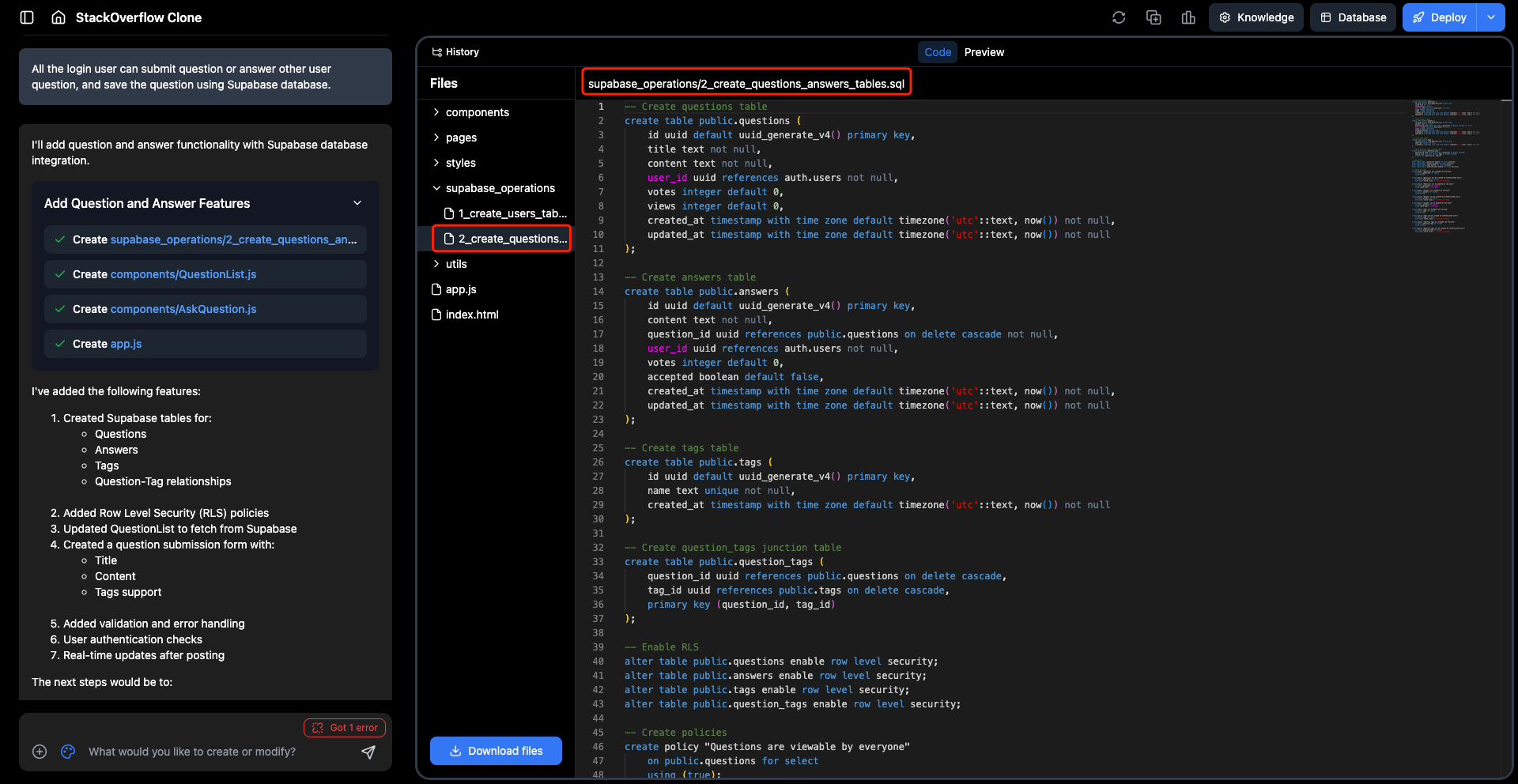 Save or fetch data using the Supabase database. By using a prompt like “Save data using Supabase database,” Trickle AI will automatically generate the data structure and utilize the Supabase database API to save or retrieve data. Below is an example:- Prompt “All logged-in users can submit questions or answer other users’ questions, and save the questions using the Supabase database.”