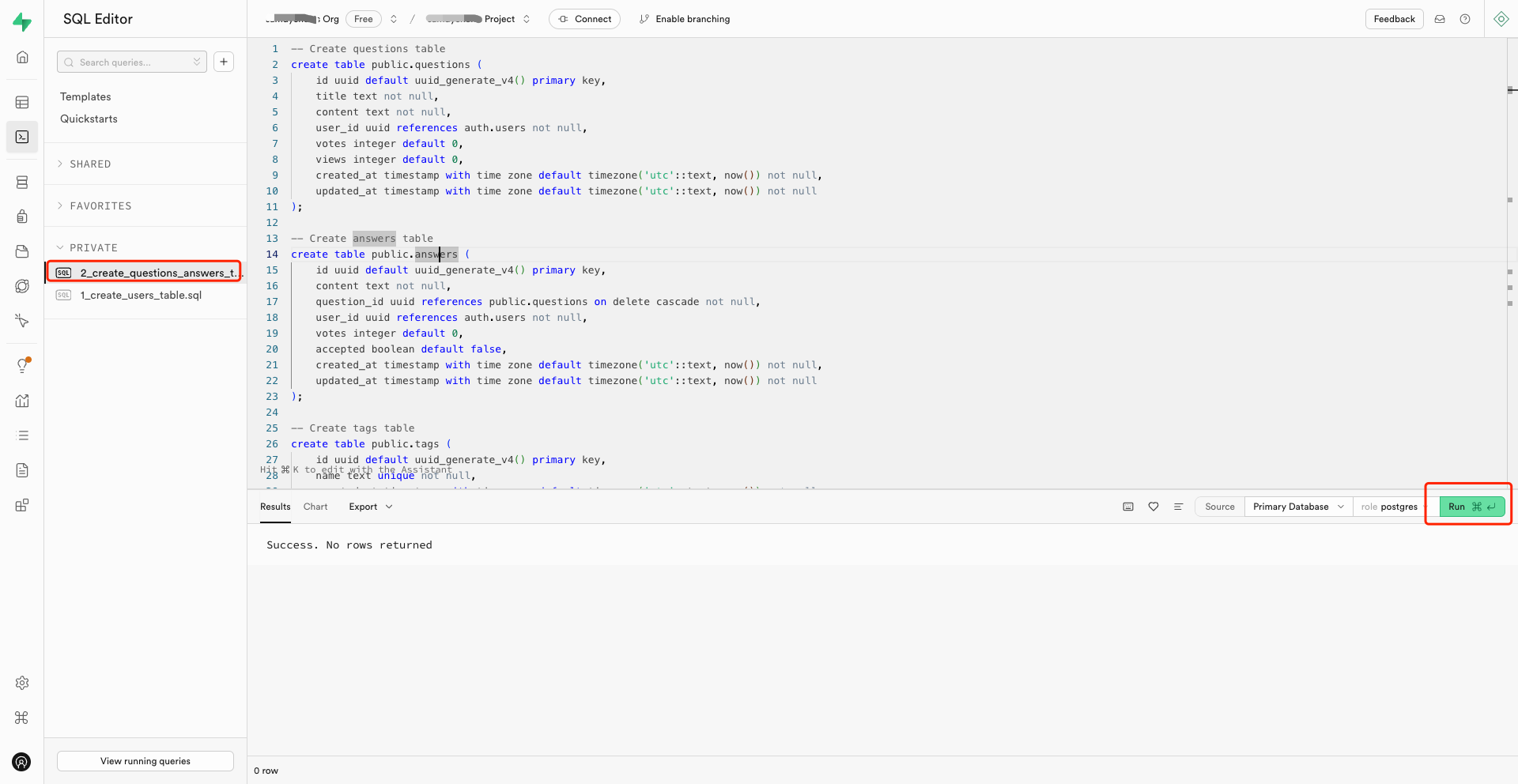 2. Copy and paste the SQL file content into your Supabase project and run the SQL script.